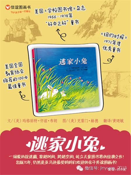 推荐理由:这个故事简单得不能再简单了,简单到了只剩下几段对话,但就是这几段对话,却让世界上的人都为之着魔。《逃家小兔》让一代又一代的家长,在孩子们睡前为他们阅读这个让他们倍感温暖的可爱的故事,还因为克莱门特画的那些画。克莱门特把一大一小两只兔子画得既写实又浪漫,对画面的衔接和处理也很有创意。你看,当小兔子说,“如果你来追我,我就要变成溪里的小鳟鱼,游得远远的。”妈妈说,“如果你变成溪里小鳟鱼,我就变成捕鱼的人去抓你”时,分别是两张黑白钢笔画,而紧随其后的两页,则合二为一,是一张全景似的横长的彩色跨页,没有对白,只有一幅色彩浓烈的想像的画面——小兔子变成了河里的一条鱼,妈妈穿着黑色的长靴,一只手拿着一个渔篓,一只手用力把渔竿甩了出去,逗人发笑的是鱼钩上拴的竟是一根鲜红的胡萝卜。这样的穿插,不仅一次又一次把故事推向高潮,而且把孩子们的想像力拓展到了一个无限的空间。必须承认,这是一本无可挑剔的图画书。《逃家小兔》总是能让年幼的小读者感到一种安详宁静的愉快。因为几乎每个幼小的孩子都曾经在游戏中幻想过像巴尼一样离开家,用这样的方式来考验妈妈对自己的爱,而这个小兔子的经历就像他们自己的游戏一样,给他们带来了一种妙不可言的安全感。